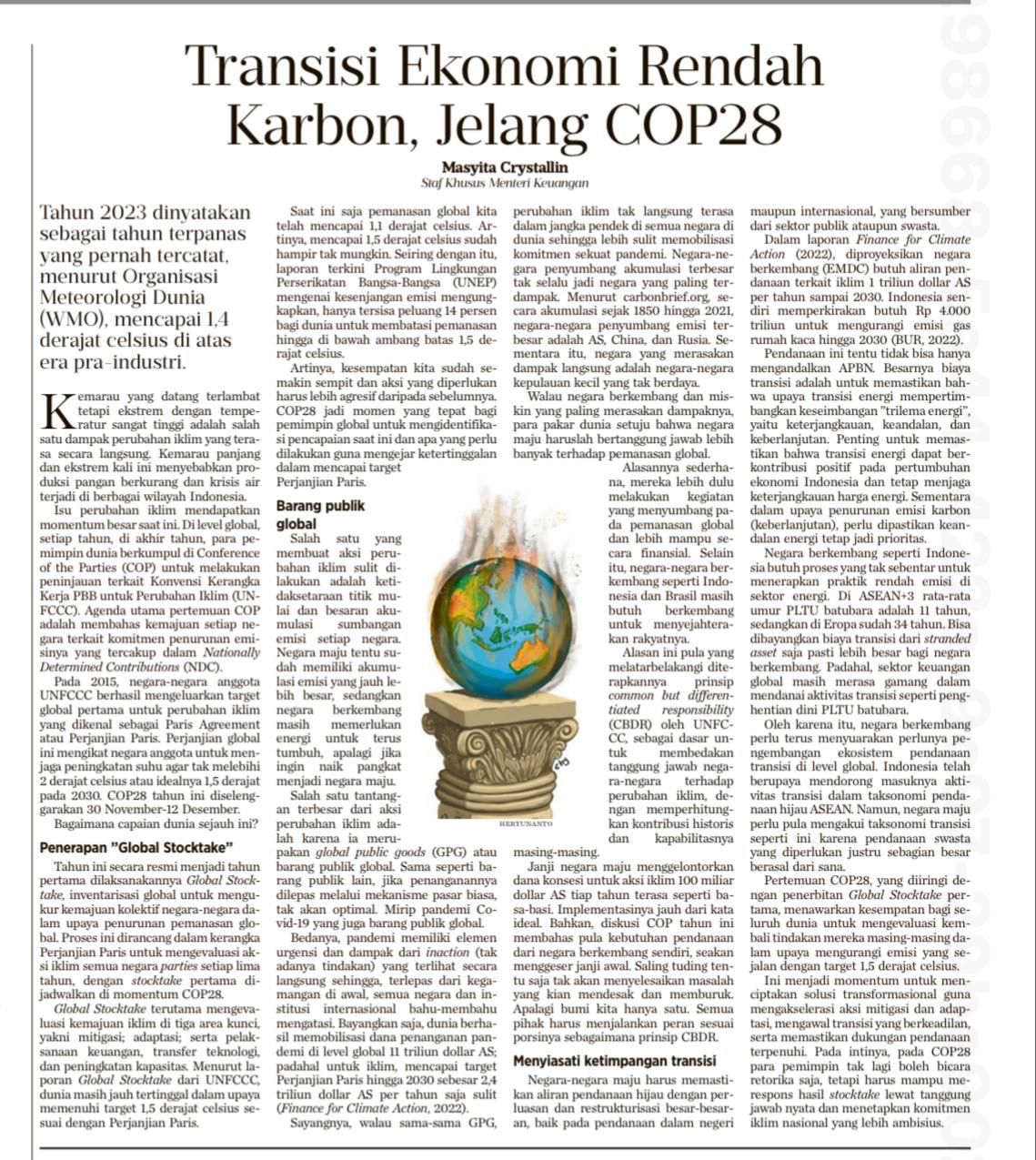 Pada tahun 2015, para negara anggota UNFCCC berhasil mengeluarkan target global pertama untuk perubahan iklim yang dikenal sebagai Paris Agreement, atau Perjanjian Paris. Perjanjian global ini mengikat negara anggota untuk menjaga peningkatan suhu untuk tidak melebihi 2 derajat Celcius (℃) atau idealnya 1,5℃ pada 2030. COP 28 tahun ini diselenggarakan di awal Desember ini, lantas, bagaimana performance dunia sejauh ini?