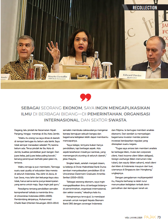 Masyita Crystallin berbagi pengalamannya selama tumbuh hingga bisa duduk di samping idolanya, Bu Menteri Keuangan, Sri Mulyani Indrawati kepada reporter Majalah Pajak (link di sini). Masyita Crystallin diangkat menjadi Staf Khusus Menkeu Bidang Perumusan Kebijakan Fiskal dan Makroekonomi satu bulan sebelum kasus pertama Covid-19 di Indonesia. Tugas Staf Khusus dan Tenaga Ahli adalah memberi masukan kepada menteri atau unit eselon yang lain, sesuai bidang keahlian masing-masing.