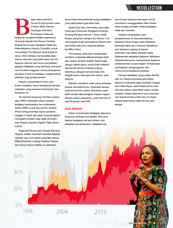 Majalah Pajak- Begitu kasus pertama Covid-19 diumumkan pada 2 Maret 2020, Menteri Keuangan (Menkeu) Sri Mulyani Indrawati langsung menginstruksikan jajarannya, termasuk kepada Staf Khusus Menkeu Bidang Perumusan Kebijakan Fiskal dan Makroekonomi Masyita Crystallin, untuk mempelajari Flu Spanyol yang terjadi di tahun 1918. Menkeu memprediksi akan adanya dampak yang lebih besar dari Flu Spanyol. Seluruh staf harus menyiapkan gagasan kebijakan yang tak biasa, termasuk merumuskan anggaran untuk penanganan pandemi Covid-19 sekaligus menjadi shock absorber bagi perekonomian.