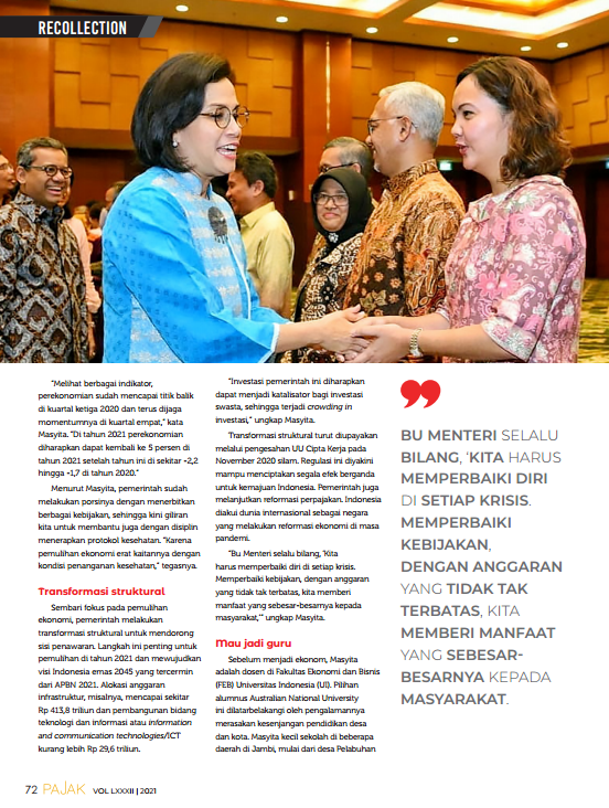 Masyita Crystallin berbagi pengalamannya selama tumbuh hingga bisa duduk di samping idolanya, Bu Menteri Keuangan, Sri Mulyani Indrawati kepada reporter Majalah Pajak (link di sini). Masyita Crystallin diangkat menjadi Staf Khusus Menkeu Bidang Perumusan Kebijakan Fiskal dan Makroekonomi satu bulan sebelum kasus pertama Covid-19 di Indonesia. Tugas Staf Khusus dan Tenaga Ahli adalah memberi masukan kepada menteri atau unit eselon yang lain, sesuai bidang keahlian masing-masing.